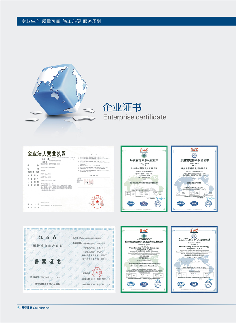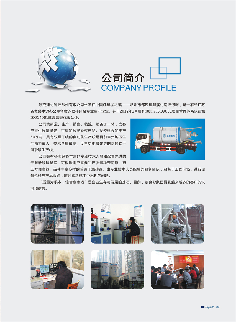 歐克建材科技常州有限公司坐落在中國燈具城之鎮(zhèn)——常州市鄒區(qū)鎮(zhèn)鶴溪村扁擔河畔,是一家經(jīng)江蘇省散裝水泥辦公室備案的預拌砂漿專業(yè)生產(chǎn)企業(yè)。并于2012年2月順利通過了ISO9001質量管理體系認證和ISO14001環(huán)境管理體系認證。 公司集研發(fā)、生產(chǎn)、銷售、物流、服務于一體為客戶提供質量穩(wěn)定、可靠的預拌砂漿產(chǎn)品。投資建設的年產(chǎn)50萬噸,具有雙烘干線的自動化生產(chǎn)線是目前常州地區(qū)生產(chǎn)能力最大、技術含量最高、設備功能最先進的塔樓式干混砂漿生產(chǎn)線。 公司擁有各類經(jīng)驗豐富的專業(yè)技術人員和配置先進的干混砂漿試驗室,可根據(jù)用戶需要生產(chǎn)質量穩(wěn)定可靠、施工方便高效、品種豐富多樣的普通干混砂漿。由專業(yè)技術人員組成的服務團隊,服務于工程現(xiàn)場,進行設備巡檢與產(chǎn)品跟蹤,隨時解決施工中出現(xiàn)的問題。 “質量為根本,信譽贏市場”是企業(yè)生存與發(fā)展的基石。目前,歐克砂漿已得到越來越多的客戶的認可和信賴。