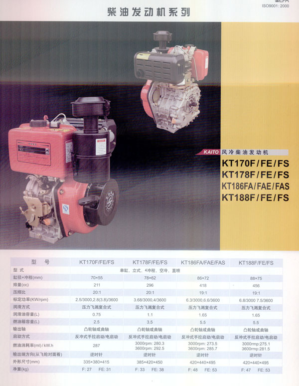 常州常柴集團(tuán)凱拓電動機(jī)械有限公司是常柴集團(tuán)所屬,集自主研發(fā)設(shè)計及生產(chǎn)的出口型產(chǎn)業(yè)基地! 〕2窦瘓F(tuán)是一家擁有近一萬名在職員工的國有大型企業(yè),年均產(chǎn)值近三億美元,平均出口總額近八千萬美元,同時也是中國內(nèi)地五百強(qiáng)企業(yè)之一! 〕2窦瘓F(tuán)凱拓電動機(jī)械有限公司的主要產(chǎn)品流水線基于日本YAMMAR型超級風(fēng)冷柴油發(fā)動機(jī),以及其配套發(fā)電機(jī)組,水泵機(jī)組和數(shù)碼變頻發(fā)電機(jī),我司目前擁有常柴集團(tuán)及凱拓品牌的知名商標(biāo)使用權(quán),旗下所有分廠如機(jī)械加工廠、鑄造廠以及發(fā)動機(jī)廠等生產(chǎn)基地都通過了ISO9001-2000質(zhì)量管理體系認(rèn)證。我司自主品牌凱拓柴油發(fā)電機(jī)組KT5000SE,KT5000LE,數(shù)碼變頻發(fā)電機(jī)KT1000Ti以及柴油發(fā)動機(jī)186F均通過德國TUV公司的CE認(rèn)證,美洲EPA認(rèn)證,因此出口量很大,近年來公司產(chǎn)品已遠(yuǎn)銷美洲、歐洲、非洲以及東南亞國家和地區(qū)! ∫劳谐2窦瘓F(tuán)的領(lǐng)先技術(shù),強(qiáng)有力的管理體制,以及健全的產(chǎn)品質(zhì)量體系,我司通過不斷優(yōu)化自主設(shè)計研發(fā),完善管理機(jī)制,期望能夠以提供最優(yōu)質(zhì)的產(chǎn)品售后服務(wù)進(jìn)一步拓展國際市場。 本著“團(tuán)結(jié)、合作、奮斗”的公司理念,我們希望著眼全球,與更多潛在的客戶開展合作交流,最終實(shí)現(xiàn)雙贏的戰(zhàn)略目標(biāo)。