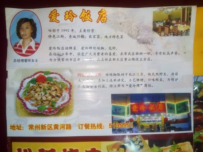 常州新北區(qū)魏村愛玲小吃部始創(chuàng)于1992年,主要經(jīng)營:特色江鮮、青城仔鵝、農(nóng)家菜、地方特色菜。 愛玲飯店招牌菜:愛玲牌螃蜞腳、龍蝦,在這十多年中,深受廣大消費(fèi)者的喜愛,在常武區(qū)獨(dú)樹一幟,享有較高聲譽(yù)。為方便常州市區(qū)新老客戶,我店在新北區(qū)黃山路設(shè)主分店。