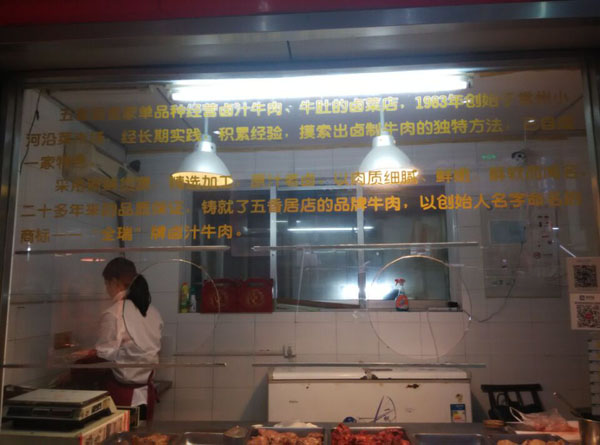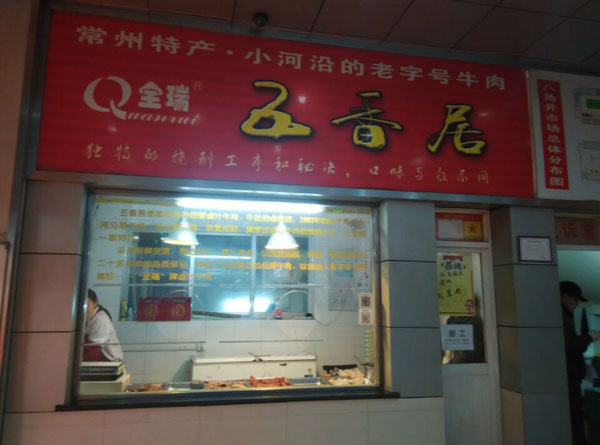 天寧區(qū)五香居牛肉店經(jīng)營鹵汁牛肉、牛肚的鹵菜店,1983年創(chuàng)始于常州小河沿菜市場,經(jīng)長期實踐,積累經(jīng)營、摸索出鹵汁牛肉的獨特方法,已自成一家特色。 采用新鮮貨源,精選加工、原汁原味,以肉質(zhì)細膩、鮮嫩,口味獨特成為二十多年來品質(zhì)的保證,鑄就了五香居店的品牌牛肉,以,創(chuàng)始人名字命名的商標——“全瑞”牌鹵汁牛肉。