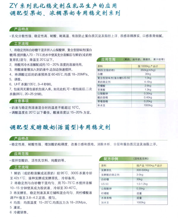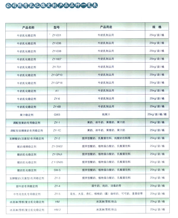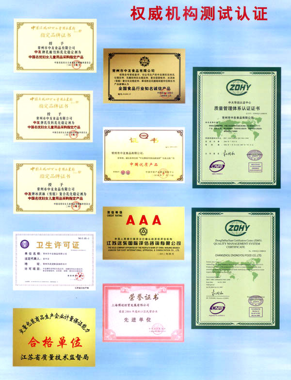 常州市中友食品有限公司。基地位于常州市東郊開(kāi)發(fā)區(qū),廠房占地面積6000平方米,擁有全新的生產(chǎn)線,先進(jìn)的生產(chǎn)流程和嚴(yán)格的質(zhì)量管理體系(工廠已通過(guò)IS09001:2000質(zhì)量管理體系的認(rèn)證)。并有專業(yè)的技術(shù)開(kāi)發(fā)和理化檢驗(yàn)的設(shè)施、經(jīng)驗(yàn)豐富的技術(shù)人員。公司以科技為依托,常年與高等院校合作,不斷地開(kāi)發(fā)和研制適合市場(chǎng)需求的食品添加劑系列產(chǎn)品。公司每年面向全國(guó)招收優(yōu)秀的博士、碩士及優(yōu)秀的大學(xué)生。公司現(xiàn)有員工1 00多人,管理人員2 0名、高工5名、產(chǎn)品專業(yè)技術(shù)開(kāi)發(fā)人員12名,還有選擇地引進(jìn)和代理國(guó)內(nèi)外各種適用的食品添加劑。 依靠本公司雄厚的科技力量和先進(jìn)的科技設(shè)備,生產(chǎn)基地已經(jīng)具備了與客戶共同開(kāi)發(fā)國(guó)內(nèi)外先進(jìn)食品添加劑的應(yīng)用技術(shù)。博適中友公司多年來(lái)致力于食品添加劑的研究和開(kāi)發(fā),突破常規(guī)理念,以市場(chǎng)、用戶為中心,研究開(kāi)發(fā)各個(gè)品種、各個(gè)檔次的食品添加劑,品種齊全又多樣,既有出口型又有內(nèi)銷(xiāo)型。公司主要穩(wěn)定劑產(chǎn)品有:乳飲料乳化穩(wěn)定劑、乳酸飲料乳化穩(wěn)定劑、冰淇淋(雪糕)復(fù)合乳化穩(wěn)定劑、果汁飲料乳化穩(wěn)定劑等,產(chǎn)品暢銷(xiāo)國(guó)內(nèi)外,覆蓋了全國(guó)二十多個(gè)省市,并建立了穩(wěn)定的銷(xiāo)售網(wǎng)絡(luò)。 本公司對(duì)產(chǎn)品指定了嚴(yán)格的質(zhì)量標(biāo)準(zhǔn),并報(bào)請(qǐng)常州市技術(shù)檢驗(yàn)監(jiān)督局審核批準(zhǔn),其技術(shù)要求完全符合GB一2760(食品添加劑使用衛(wèi)生標(biāo)準(zhǔn))和符合聯(lián)合國(guó)直接衛(wèi)生組織(WHO)、聯(lián)合國(guó)食品與農(nóng)業(yè)組織(FAO)以及美國(guó)食品和藥物管理局的有關(guān)規(guī)定。 長(zhǎng)期以來(lái),博適中友公司以市場(chǎng)定位為基本依據(jù),堅(jiān)持發(fā)展并開(kāi)辟多元化的國(guó)內(nèi)外市場(chǎng):以專業(yè)化、長(zhǎng)遠(yuǎn)化、規(guī);癁榻(jīng)營(yíng)思路:以開(kāi)拓創(chuàng)新,務(wù)實(shí)誠(chéng)信為經(jīng)營(yíng)理念,不斷促進(jìn)企業(yè)發(fā)展壯大。 公司自創(chuàng)建以來(lái),始終不渝地堅(jiān)持質(zhì)量第一、信譽(yù)至上,以精湛的工藝加工產(chǎn)品,不管是標(biāo)準(zhǔn)的或特制的都可享有本公司優(yōu)良的技術(shù)服務(wù)。無(wú)論您需要何種功能性添加劑,博適中友食品添加劑公司均能滿足您的要求。博適中友公司以價(jià)格合理、服務(wù)周到為經(jīng)營(yíng)宗旨,努力引導(dǎo)食品添加劑應(yīng)用發(fā)展的新潮流、新方向。在才能卓越的領(lǐng)導(dǎo)者的帶領(lǐng)下,全體員工以開(kāi)拓、創(chuàng)新、求實(shí)、守信為企業(yè)精神,不斷地提高自身的素質(zhì)。 公司的宗旨是“開(kāi)拓創(chuàng)新發(fā)展、精誠(chéng)服務(wù)和諧”為目標(biāo),熱忱與各界有識(shí)之士攜手共進(jìn),共創(chuàng)輝煌!如今公司業(yè)務(wù)蒸蒸日上,專業(yè)技術(shù)研究越走越精,這都與廣大客戶大力支持分不開(kāi)。在新世紀(jì)來(lái)臨之際,上海博適中友公司愿與您真誠(chéng)合作,攜手并進(jìn),共鑄新的輝煌!
