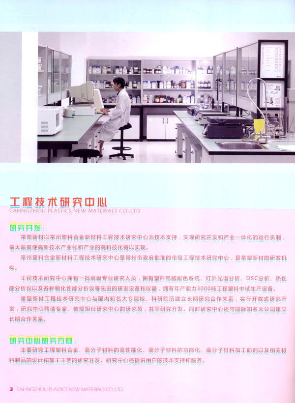 常州常塑新材料有限公司(原名常州塑料集團新材料有限公司)是一家民營股份制企業(yè)。主要從事高分子材料和塑料助劑的研究開發(fā)、生產(chǎn)、銷售、服務(wù)。 常塑新材料以常州塑料集團與韓國新湖油化合資建設(shè)的10萬噸ABS樹脂為基礎(chǔ),和與德國吉瑪公司合資建設(shè)的20萬噸PET樹脂。以常州塑料集團工程技術(shù)研究中心為技術(shù)依托,實現(xiàn)科研與產(chǎn)業(yè)一體化的組合模式。 公司建設(shè)年產(chǎn)3萬噸工程塑料生產(chǎn)基地,生產(chǎn)各種阻燃ABS、耐熱ABS樹脂、工程塑料合金、功能高分子材料以及塑料助劑等產(chǎn)品。 公司目標:把常塑新材料建設(shè)成一流的高分子材料研究開發(fā)、生產(chǎn)、銷售、服務(wù)的高科技企業(yè)。 公司理念和價值觀:誠信經(jīng)營、不斷創(chuàng)新、追求卓越、創(chuàng)造價值。 公司旨在創(chuàng)造以人為本不斷創(chuàng)新的企業(yè)可持續(xù)發(fā)展的核心競爭力,為社會創(chuàng)造價值。