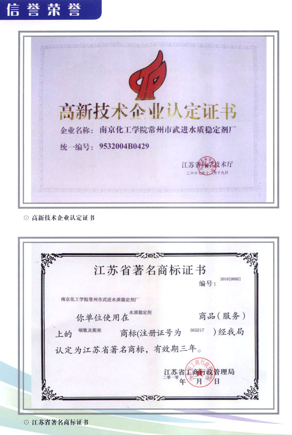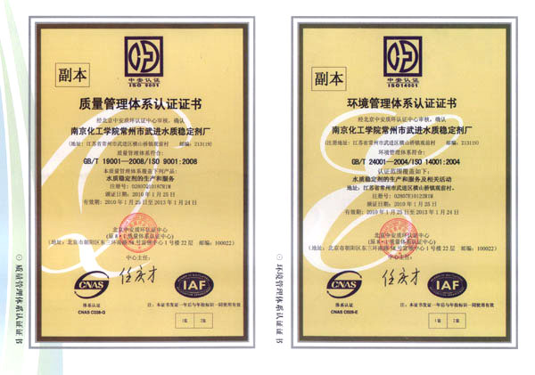 企業(yè)運(yùn)用嚴(yán)密的科學(xué)管理,配有先進(jìn)的工藝技術(shù)和精良的生產(chǎn)裝備,保持高標(biāo)準(zhǔn)的產(chǎn)品質(zhì)量。所生產(chǎn)的水質(zhì)穩(wěn)定劑達(dá)到或超過國(guó)際先進(jìn)水平,擁有PBTCA等多個(gè)江蘇省高新技術(shù)產(chǎn)品,DPSC緩蝕阻垢劑被列為國(guó)家星火計(jì)劃項(xiàng)目,工業(yè)循環(huán)水用新型緩蝕阻垢殺菌劑被國(guó)務(wù)院評(píng)為國(guó)家科技進(jìn)步二等獎(jiǎng)。主要產(chǎn)品均通過部、省級(jí)科技成果鑒定,連續(xù)十多年被中國(guó)石化總公司評(píng)定為合格推薦產(chǎn)品。企業(yè)已通過IS09001、IS014001國(guó)際質(zhì)量、環(huán)境認(rèn)證,為國(guó)內(nèi)外石化行業(yè)、冶金、鋼鐵、化肥、電力、紡織等領(lǐng)域的工業(yè)循環(huán)冷卻水的水質(zhì)處理提供了必不可少的配套產(chǎn)品。