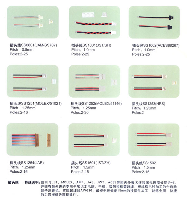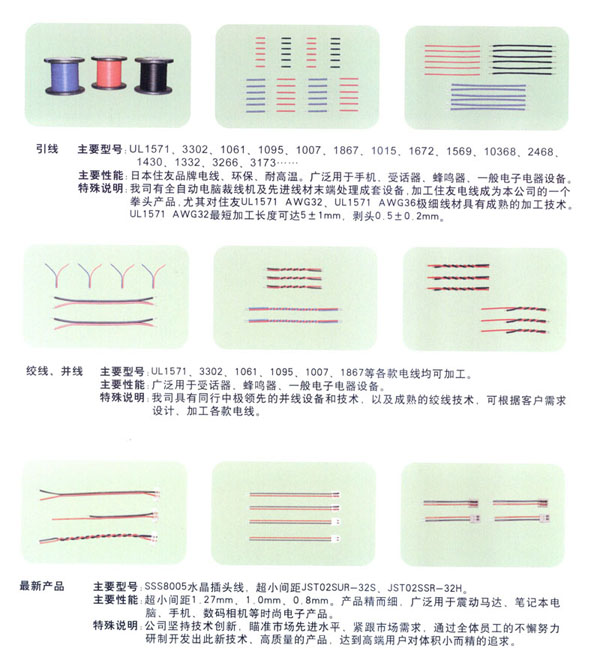 常州市匯創(chuàng)電子有限公司我公司2000年8月成立.端子連接線生產(chǎn)有10余年的經(jīng)驗.結(jié)合韓國連接線生產(chǎn)技術(shù),致力于筆記本電腦,手機,數(shù)碼相機等高端行業(yè)的小間距的端子連接線的研究和生產(chǎn).小間距端子連接線的插頭的常規(guī)型號有 SH/1.0mm, 51021-0200/1.25mm, ZH , PH, EH, XH, SAN, SCN, 2510 等.特殊插頭型號有:02SUR-32S,02SSR-32H.材料用原廠進口的JST, MOLEX,或臺資廠家的(根據(jù)客戶需要).全環(huán)保,無鉛化生產(chǎn).2008年開始導(dǎo)入無鹵素要求。企業(yè)已經(jīng)通過ISO9001-2000質(zhì)量管理體系.質(zhì)量好!交貨快!價格合理!是目前常州AAC等多家大型受話器廠家的優(yōu)秀供應(yīng)商.客戶遍及常州周邊,蘇州,昆山,上海,深圳,嘉興,山東,重慶等地.也有直接出口韓國,臺灣.現(xiàn)有高素質(zhì)員工100人左右.廠房面積2000平方米.