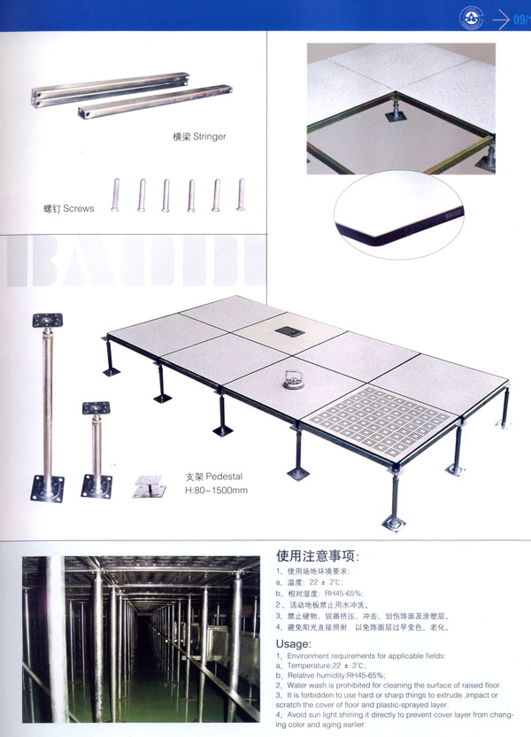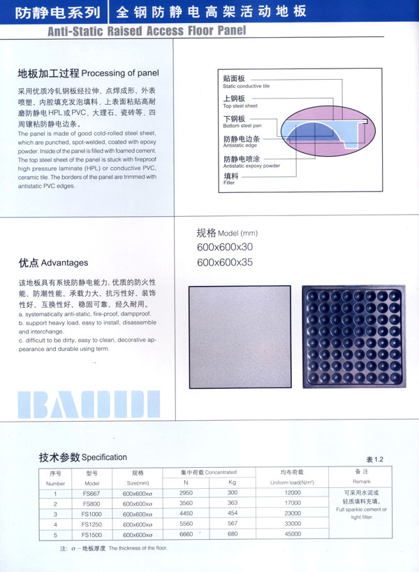 常州市寶進防靜電設備有限公司是各類防靜電產品開發(fā)、設計、制造、安裝服務于一體的企業(yè)。以上海物理學會空間靜電專業(yè)委員會強大的技術力量為后盾。公司主要致力于各類機房、電氣室設計、安裝;各類防靜電干擾處理及用戶特種需求。公司擁有防空間靜電干擾—聲學復合系統(tǒng)、輕質全鋼活動地板、高環(huán)保型抗靜電貼面等多項發(fā)明專利,是國內該行業(yè)中唯一擁有自主知識產權的企業(yè)。 公司主要產品“寶迪”牌 防靜電高架地板及板材、OA網絡地板。產品廣泛用于電子廠房、金融系統(tǒng)、電力、廣電、軍隊及智能化樓宇。并向多個國家出口。 針對發(fā)泡水泥填充的全鋼高架地板自身重、承載差的缺點,我們開發(fā)了輕質全鋼高架地板。在提前地板承載的同時,大幅減輕了地板的自重。 公司一貫嚴格執(zhí)行ISO9001-2000質量保證體系,為用戶提供高品質的產品及完善的售后服務是公司一貫的宗旨。