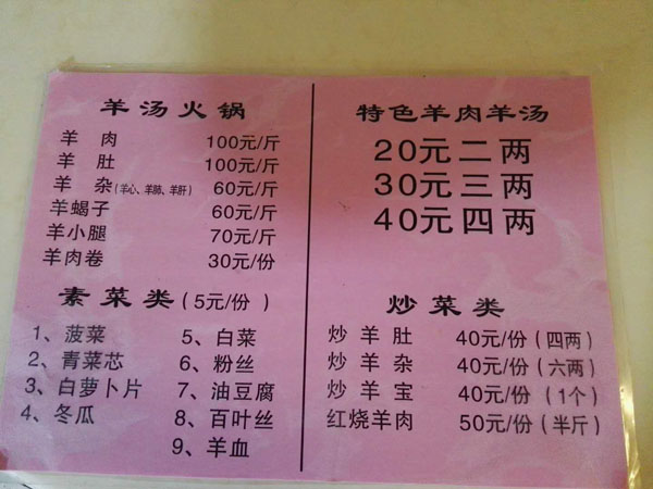 天寧區(qū)紅梅奧彩小吃店(紅梅羊湯店)成立十四年,特色是羊湯, 羊肉是中國人民食用的主要肉類之一.羊肉比其他肉類的肉質要細嫩,而且膽固醇含星低。相對其他肉類而言,羊肉蛋白質含量較多,脂肪含量較少。維生素B1、B2、B6以及鐵、鋅、硒的含量頗為豐富。此外,羊肉肉質細嫩容易消化吸收.多吃羊肉有助于提高身體免疫力。 羊肉熱量比牛肉要高.中醫(yī)認為,羊肉具有補精血,益虛勞.溫中健脾,補腎壯陽,養(yǎng)薛等功能,尤其適合老年人、體虛的人群食用。 羊肉的大部分脂肪都可看得見,很容易去除。羊腿部肉、肋骨和腰部肉比肩胛肉瘦。每100克烤羊腿中.含蛋白質28克、脂肪7克、膽固醇100毫克.能提供的熱量是757.7千焦。 羊羔肉富含蛋白質、鋅和維生素B族,其中煙酸、維生素B2和維生素B12的含量壟基圭富.羊羔肉中鎂、鉀和磷的含量也較高,并易于吸收。