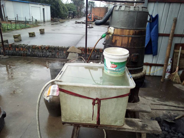 第二步:冷卻降溫,糯米蒸熟后,用冷水淋沐,直至糯米飯溫度降到35℃左右。要知道這個溫度非常關(guān)鍵,太冷了會影響之后酒曲發(fā)酵,溫度太高會把酒曲中的酵母殺死。不靠溫度計,老徐靠得完全是自己多年的經(jīng)驗。