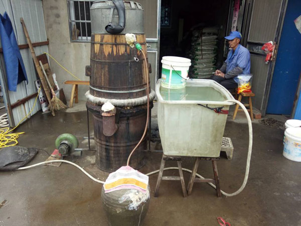 第四步:放入缸中,酒曲和糯米拌好后,便可放入屋內(nèi)的大缸中,并在其中挖出個圓形的洞,放入竹筒做酒窩。在此之前,大缸可用之前冷卻糯米飯的溫水擦一擦暖缸,這樣更有益于酒曲發(fā)酵。為了保證酒曲發(fā)酵的溫度,還要給酒料附上塑料薄膜。若是氣溫低于零度,還得多蓋上幾層棉被才行。像池阿姨家的400斤糯米,老徐至少要重復(fù)這些步驟八遍!大缸中的酒料大約發(fā)酵了10天左右,在酒乳已非常豐富之際,按照1:1的比例,打開封口加入冷開水,然后再蓋上棉被。繼續(xù)放置45天后,米酒才算大功告成!如果覺得米酒不過癮,老徐還會將米酒吊成燒酒,也就是白酒,依舊是傳統(tǒng)的老手藝。未來某天,TA會消失 ,其實,做米酒的方法并不難,幾乎是以前家家戶戶的必備技能。然而現(xiàn)如今,不僅老常州們不再自己做酒,就連像老徐這樣的做米酒手藝人也越來越少。就連跟了老徐三十多年的一套米酒家當(dāng),也同樣經(jīng)不起歲月:鐵鍋漏了要去找橫山橋的老師傅;木桶壞了要去禮嘉修;爐子也有專門的式樣,過幾年就要拿著圖紙找人翻新......