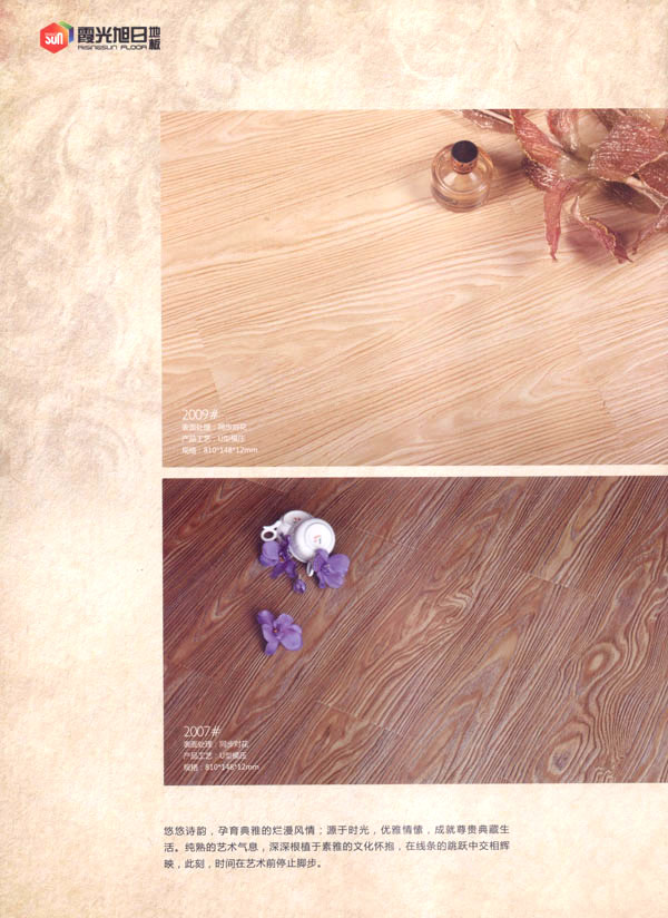 品牌保證,質(zhì)量放心 公司旗下“霞光.旭日”品牌地板系列由旭日皇家、旭日經(jīng)典、旭日戀家、至尊奢華、巧奪天工、水晶陶瓷等幾個(gè)系列構(gòu)成,配有專職質(zhì)量檢驗(yàn)人員,嚴(yán)把產(chǎn)品質(zhì)量關(guān),不斷完善產(chǎn)品質(zhì)量體系、監(jiān)控管理體系。公司對(duì)客戶需求全面、科學(xué)、準(zhǔn)確地把握,確保對(duì)客戶市場(chǎng)適時(shí)高效反應(yīng)。一流的設(shè)備、精心的選材、完美的工藝以及對(duì)產(chǎn)品品味不倦的追求,令奔公司產(chǎn)品獨(dú)樹一幟。