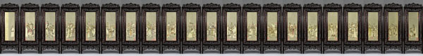 4 牙刻《三國演義圖》,作者懷著對牙刻藝術(shù)的鐘愛,對中華古老文化之敬仰,肩負(fù)時代之重托,賦予作者堅(jiān)韌不撥的決心和毅力。牙刻《三國演義》創(chuàng)作靈感被點(diǎn)燃,博大、深遂、精致而具有鮮明文化特質(zhì)的牙刻作品自然天成,得以成就夢寐以求的作品。由微雕63萬余漢字《三國演義》全文作為灰色背景,105枚金石名章烘托出《三國演義》名著中各領(lǐng)風(fēng)騷、形象鮮明的126個主要人物。由21扇牙刻紫檀組合成3.28米長的巨型屏風(fēng),寓意著對美好21世紀(jì)的憧憬。小牙刻大題材、大系列、大氣魄、大氣象,最終產(chǎn)生巨大的震撼力。牙刻《三國演義》如此恢弘絕無僅有、前無古人。從表象看牙刻與微雕的融合、書法金石與人物的呼應(yīng)、灰色背景與墨彩的烘托,精雕紫檀與微雕牙刻的對照,而深層次看這些都是繪畫語言在牙刻藝術(shù)中的完美體現(xiàn),也突破了千余年來固守線刻傳統(tǒng)的窠臼,提升了當(dāng)今牙刻藝術(shù)的品位并注入新的活力,將牙刻從藝人勞動升華為藝術(shù)家從事的創(chuàng)作。這件作品是我歷時五年于2001年10月雕刻而成,一經(jīng)展出引起了工藝美術(shù)界高度關(guān)注,獲得了首屆中國華東工藝美術(shù)精品展金獎、第三屆國家級工藝美術(shù)大師精品展金獎、首屆中國工藝美術(shù)學(xué)會最高學(xué)術(shù)獎“華藝杯”金獎。
