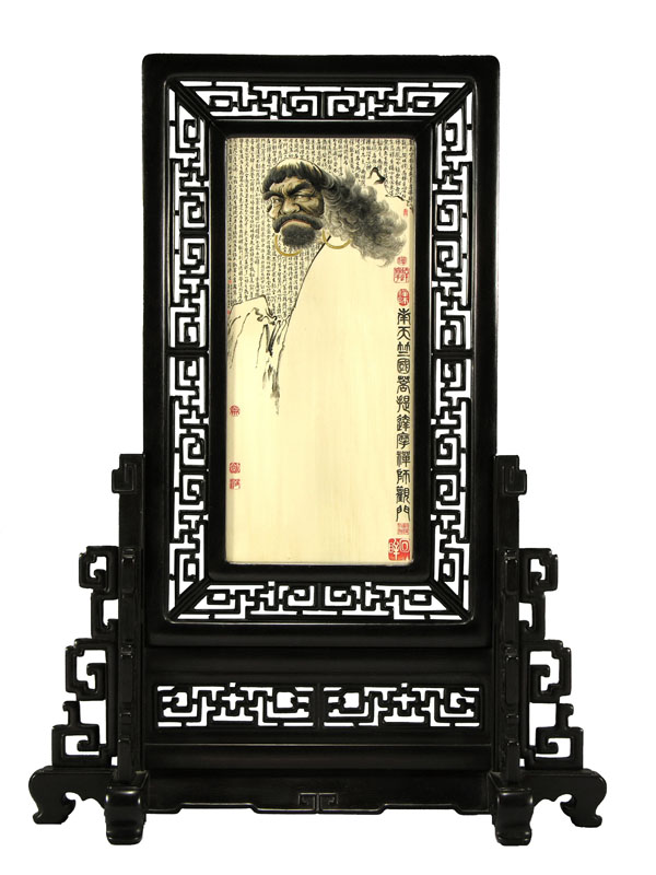 2牙刻《回眸》傳神的刻畫了達(dá)摩禪師回眸間投來的眼神,就像一位飽經(jīng)風(fēng)霜的老者,有幾經(jīng)坎坷的人生故事向你訴說,有多少世態(tài)炎涼人生哲理向你傳遞;仨g風(fēng)中飄逸的須發(fā)、寬聳的鼻梁、緊鎖的眉頭,乃至畫面中作者極力奉獻(xiàn)給觀者的、達(dá)摩那炯炯有神的眼睛,像大海那么寬廣、像宇宙那么深遂。畫面背景銘刻達(dá)摩相關(guān)禪的精辟論著,更顯佛的天國,禪的意境。幾枚大小相間的朱紅印章散發(fā)幾分文雅氣息。人物的須發(fā)看似瀟灑的筆墨一揮而就,其實(shí)借助放大鏡看去烏黑發(fā)亮、密密層層的須發(fā)根根可數(shù)、飄逸迷人。既突出筆墨與刀法,又凸顯內(nèi)涵與精神,是作者勤于雕刻而又修煉于雕刻之外的結(jié)晶。 此作獲首屆中國華東工藝美術(shù)精品展特等金獎,為中國工藝美術(shù)館珍藏。