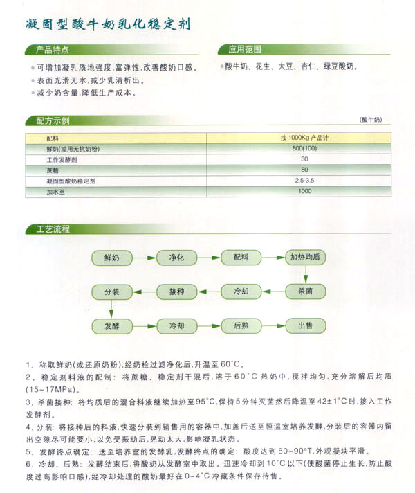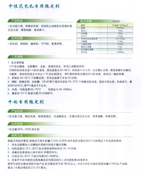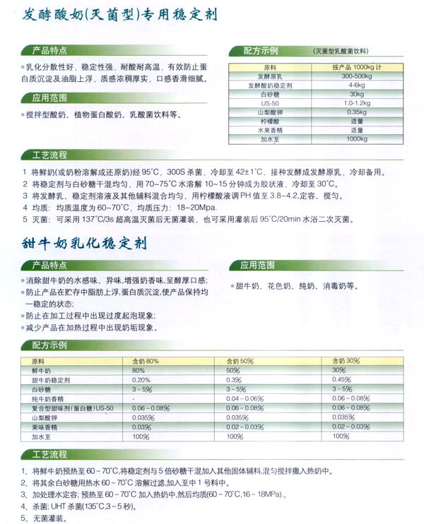 常州市中友食品有限公司。基地位于常州市東郊開發(fā)區(qū),廠房占地面積6000平方米,擁有全新的生產線,先進的生產流程和嚴格的質量管理體系(工廠已通過IS09001:2000質量管理體系的認證)。并有專業(yè)的技術開發(fā)和理化檢驗的設施、經驗豐富的技術人員。公司以科技為依托,常年與高等院校合作,不斷地開發(fā)和研制適合市場需求的食品添加劑系列產品。公司每年面向全國招收優(yōu)秀的博士、碩士及優(yōu)秀的大學生。公司現(xiàn)有員工1 00多人,管理人員2 0名、高工5名、產品專業(yè)技術開發(fā)人員12名,還有選擇地引進和代理國內外各種適用的食品添加劑。 依靠本公司雄厚的科技力量和先進的科技設備,生產基地已經具備了與客戶共同開發(fā)國內外先進食品添加劑的應用技術。博適中友公司多年來致力于食品添加劑的研究和開發(fā),突破常規(guī)理念,以市場、用戶為中心,研究開發(fā)各個品種、各個檔次的食品添加劑,品種齊全又多樣,既有出口型又有內銷型。公司主要穩(wěn)定劑產品有:乳飲料乳化穩(wěn)定劑、乳酸飲料乳化穩(wěn)定劑、冰淇淋(雪糕)復合乳化穩(wěn)定劑、果汁飲料乳化穩(wěn)定劑等,產品暢銷國內外,覆蓋了全國二十多個省市,并建立了穩(wěn)定的銷售網絡。 本公司對產品指定了嚴格的質量標準,并報請常州市技術檢驗監(jiān)督局審核批準,其技術要求完全符合GB一2760(食品添加劑使用衛(wèi)生標準)和符合聯(lián)合國直接衛(wèi)生組織(WHO)、聯(lián)合國食品與農業(yè)組織(FAO)以及美國食品和藥物管理局的有關規(guī)定。 長期以來,博適中友公司以市場定位為基本依據(jù),堅持發(fā)展并開辟多元化的國內外市場:以專業(yè)化、長遠化、規(guī);癁榻洜I思路:以開拓創(chuàng)新,務實誠信為經營理念,不斷促進企業(yè)發(fā)展壯大。 公司自創(chuàng)建以來,始終不渝地堅持質量第一、信譽至上,以精湛的工藝加工產品,不管是標準的或特制的都可享有本公司優(yōu)良的技術服務。無論您需要何種功能性添加劑,博適中友食品添加劑公司均能滿足您的要求。博適中友公司以價格合理、服務周到為經營宗旨,努力引導食品添加劑應用發(fā)展的新潮流、新方向。在才能卓越的領導者的帶領下,全體員工以開拓、創(chuàng)新、求實、守信為企業(yè)精神,不斷地提高自身的素質。 公司的宗旨是“開拓創(chuàng)新發(fā)展、精誠服務和諧”為目標,熱忱與各界有識之士攜手共進,共創(chuàng)輝煌!如今公司業(yè)務蒸蒸日上,專業(yè)技術研究越走越精,這都與廣大客戶大力支持分不開。在新世紀來臨之際,上海博適中友公司愿與您真誠合作,攜手并進,共鑄新的輝煌!