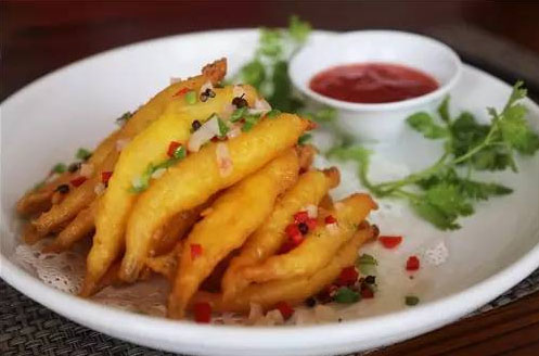 椒鹽大銀魚 從張總口中得知,原來太湖銀魚約有4種,眼前這道菜選用的就是個頭最大的銀魚,也叫柴魚。只是簡單地裹了面粉下鍋油炸,撒上點自配椒鹽料,酸甜汁作輔。盤中堆成“金色小山”看著美,聞著香,吃著鮮。區(qū)別于上一道菜,對這盤銀魚你大可放開了吃,一口一個,體驗脆香表皮中肥美的滋味在口中迸發(fā),絕對是極致的享受。