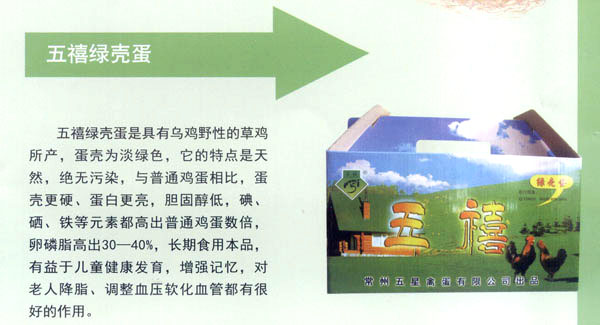常州五星禽蛋有限公司創(chuàng)建于1990年,是常州市最大的禽蛋生產(chǎn)基地。公司秉承“辦實(shí)事、服務(wù)城市;上水平,掙創(chuàng)效益”的經(jīng)營宗旨。注重科技開發(fā)與管理創(chuàng)新,全力打造“五禧”品牌。公司于2000年通過了ISO9002質(zhì)量體系認(rèn)證;2004年又通過了無公害雞蛋產(chǎn)地和產(chǎn)品認(rèn)證,并獲兩項(xiàng)專利。 經(jīng)多年努力實(shí)現(xiàn)了“五禧”產(chǎn)品系列化,F(xiàn)公司每年向市場提供有“五禧”鮮雞蛋,“五禧”土雞蛋,“五禧”ELC蛋,“五禧”綠殼草雞蛋,成為了不同消費(fèi)群體的理想選擇!拔屐钡岸啻螛s獲常州市場知名商標(biāo)稱號(hào)。