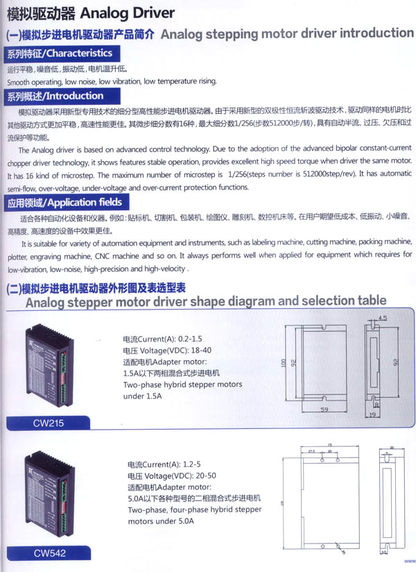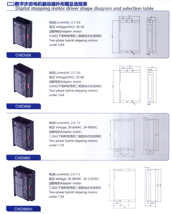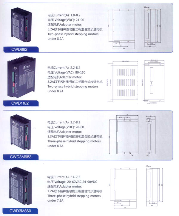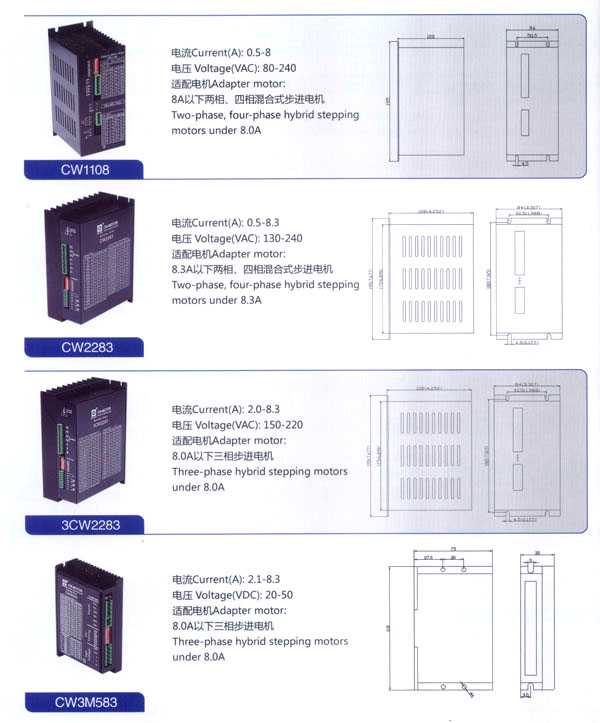 我公司的主要產品有20BH系列、28BH系列、35BH系列、39BH系列、42BH系列、42BHH系列、57BH圓形系列、57BHH方形系列、60BHH方形系列、86BH圓形系列、86BHH方形系列,以及110BHH系列的四相(二相)混合式步進電。CW60BL、CW63BL、CW70BL、CW92BL系列無刷電機也相繼上市。另外步進電機驅動器CW215、CW230、CW5045、CW8060、CW6060AC、CW1108以及全新數(shù)字式驅動器CWD230、CWD556、CWD860H、CW2M2208、CW3M2208和閉環(huán)電機驅動器CWDS556,CWDS660,CWDS860H,CWDS880L,CWDS1108,CWDS2206等系列也暢銷全球。另外本公司也可對外承接各種步進電機及相關工控系統(tǒng)的應用系統(tǒng)工程。