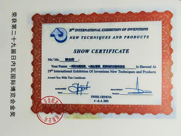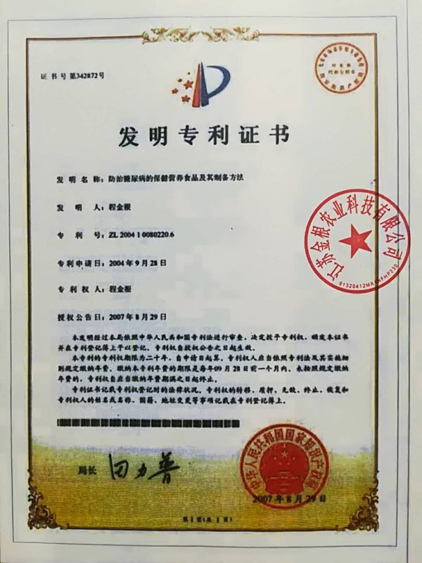 本產(chǎn)品原料是在高寒、高濕、旱地等種植,要求施農(nóng)家肥,采用生物治蟲(chóng),因此是無(wú)公害的優(yōu)良品種。目前公司有四個(gè)種植基地,分別在江西、江蘇、陜西等地。 一種防治糖尿病功能性食品專(zhuān)利號(hào):ZL99119217.6。 “程金根”系列產(chǎn)品先后獲得二項(xiàng)發(fā)明專(zhuān)利,并經(jīng)聯(lián)合國(guó)科技成果評(píng)估論證為A級(jí)產(chǎn)品,屬世界領(lǐng)先技術(shù)。在韓國(guó)、美國(guó)、香港、德國(guó)分別榮獲新技術(shù)、新產(chǎn)品博覽會(huì)金獎(jiǎng)。