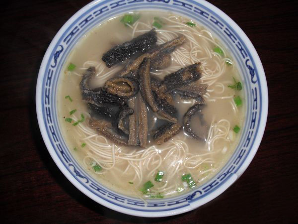 常州新北區(qū)孟河公陽小吃店從事鱔絲面23年,經(jīng)營面積100平方米,黃鱔全是野生,面湯采用高湯制作(鱔魚湯),下面的時候先用開水把黃鱔燙熟,然后用竹刀批下二條黃鱔肉,除去骨頭肚腸,切成段后入油鍋里炸酥,再用白湯烹制成為面澆頭。而面湯是用鱔魚骨頭、豬骨等用大鍋猛火煮上三、四個鐘頭,成為一鍋濃濃的白湯,再進行調味,吃到嘴里全身舒坦。