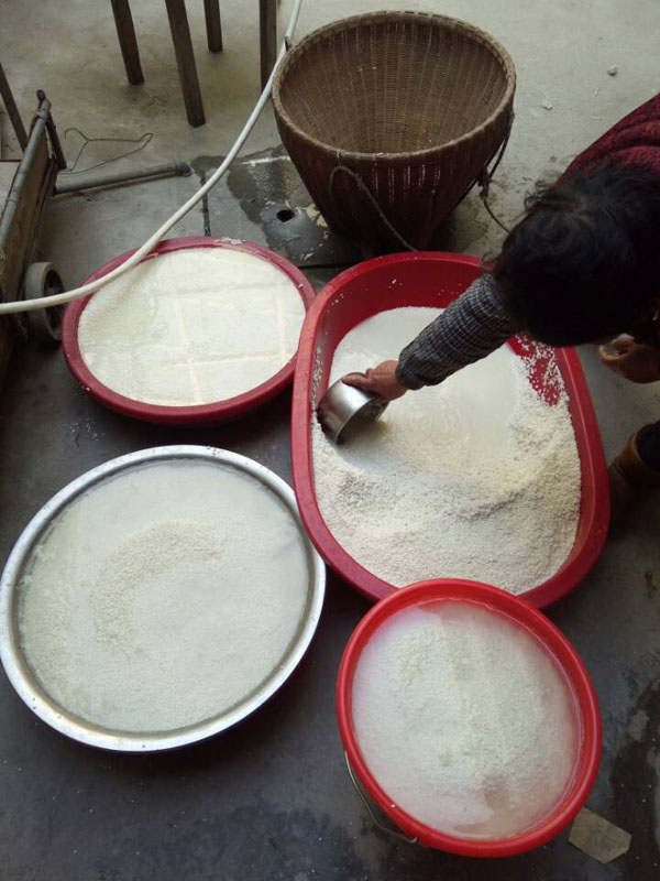 第二步:冷卻降溫,糯米蒸熟后,用冷水淋沐,直至糯米飯溫度降到35℃左右。要知道這個(gè)溫度非常關(guān)鍵,太冷了會(huì)影響之后酒曲發(fā)酵,溫度太高會(huì)把酒曲中的酵母殺死。不靠溫度計(jì),老徐靠得完全是自己多年的經(jīng)驗(yàn)。