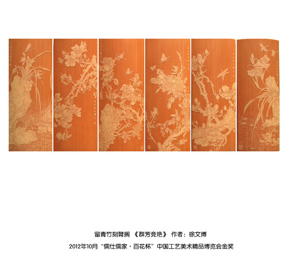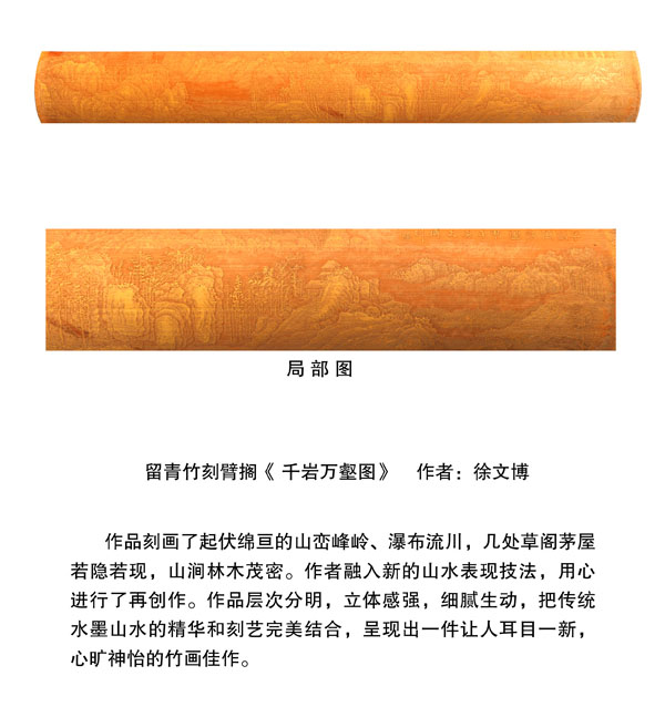 徐博(藝名文博),1973年生,江蘇武進(jìn)人,江蘇省省名人,高級(jí)工藝美術(shù)師,常州市留青竹刻非遺傳承人,常州工藝美術(shù)家協(xié)會(huì)理事,被譽(yù)為當(dāng)今中國(guó)最具創(chuàng)新意識(shí)的新銳竹刻家代表,多次獲得國(guó)家工藝美術(shù)大獎(jiǎng)?釔哿羟嘀窨痰男煳牟┵p竹為樂(lè),以竹詠志,借竹抒懷,悉心探索留青竹刻的藝術(shù)表現(xiàn)。在中國(guó)工藝美術(shù)大師蕭劍波的精心指導(dǎo)下,開創(chuàng)留青水墨山水之技法,更好的體現(xiàn)了竹刻淡雅清秀的藝術(shù)風(fēng)格,并不斷汲取書畫、攝影、雕塑等藝術(shù)精華,不斷滋養(yǎng)藝術(shù)情趣,提升擴(kuò)展胸襟人格的同時(shí)也逐步形成了其形神兼?zhèn),虛?shí)相生,氣韻生動(dòng)的藝術(shù)特點(diǎn),作品為眾多的國(guó)內(nèi)外收藏家珍藏。
