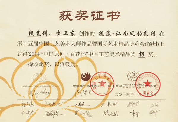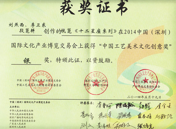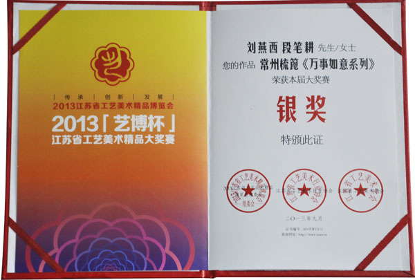 公司榮譽(yù)介紹: “2009年常州市旅游商品創(chuàng)新設(shè)計(jì)大賽”,“覽盡千荷”綠檀雕刻梳榮獲三等獎(jiǎng); “2011年常州市旅游商品創(chuàng)新設(shè)計(jì)大賽”,“彩印工藝梳-我們的年代(80)”榮獲二等獎(jiǎng)。 “2011年中國(guó)包裝創(chuàng)意設(shè)計(jì)大賽“,虞美人彩印梳篦系列包裝獲得一等獎(jiǎng); “2011年中國(guó)包裝創(chuàng)意設(shè)計(jì)大賽”,虞美人筷子系列包裝獲得三等獎(jiǎng); “2011創(chuàng)意中國(guó).第五屆設(shè)計(jì)藝術(shù)大獎(jiǎng)賽”,虞美人系列包裝獲得三等獎(jiǎng); “2011首屆中國(guó)(無(wú)錫)國(guó)際文化藝術(shù)博覽會(huì)”,漆藝對(duì)梳《喜玫瑰》獲得“藝博杯“銅獎(jiǎng)。 “第十三屆中國(guó)工藝美術(shù)大師作品暨國(guó)際藝術(shù)精品博覽會(huì)”, 漆藝梳《報(bào)喜鳥(niǎo)》榮獲2012“儒士儒家•百花杯”中國(guó)工藝美術(shù)精品獎(jiǎng)優(yōu)秀獎(jiǎng) “第十三屆中國(guó)工藝美術(shù)大師作品暨國(guó)際藝術(shù)精品博覽會(huì)”, 虞美人《渾然天成》榮獲2012“儒士儒家•百花杯”中國(guó)工藝美術(shù)精品獎(jiǎng)金獎(jiǎng) “2012江蘇省工藝美術(shù)精品大獎(jiǎng)賽”,虞美人《S型梳》喜獲“藝博杯”銀獎(jiǎng) “第十四屆中國(guó)工藝美術(shù)大師作品暨國(guó)際藝術(shù)精品博覽會(huì)”, 虞美人工藝梳《新型十二星座梳》榮獲2013“國(guó)信•百花杯”中國(guó)工藝美術(shù)精品獎(jiǎng)優(yōu)秀獎(jiǎng) “2013【藝博杯】江蘇省工藝美術(shù)精品大獎(jiǎng)賽”,虞美人《萬(wàn)事如意系列》喜獲“藝博杯”銀獎(jiǎng) “2013江蘇省工藝美術(shù)新人新作成果展作品大獎(jiǎng)賽”,虞美人《壺(福)的藝術(shù)》喜獲“藝博杯”入圍獎(jiǎng) 2013年度江蘇省“蘇商領(lǐng)袖峰會(huì)”,常州市卓尚飾品有限公司榮獲最具成長(zhǎng)性企業(yè)獎(jiǎng) 常州市卓尚飾品(虞美人)有限公司總經(jīng)理李衛(wèi)東榮獲“常州創(chuàng)意產(chǎn)業(yè)協(xié)會(huì)2013年底慈善獎(jiǎng)榮譽(yù)” 常州市卓尚飾品有限公司榮獲薛家鎮(zhèn)人民政府2013年度“創(chuàng)新創(chuàng)優(yōu)”獎(jiǎng) 常州市卓尚飾品有限公司榮獲薛家鎮(zhèn)人民政府2013年度“銷(xiāo)售業(yè)績(jī)”獎(jiǎng) 2014中國(guó)(深圳)國(guó)際文化產(chǎn)業(yè)博覽交易會(huì),劉燕西、李衛(wèi)東、段筆耕<十二星座系列>獲得“中國(guó)工藝美術(shù)文化創(chuàng)意獎(jiǎng)”銀獎(jiǎng) 2014中國(guó)(深圳)國(guó)際文化產(chǎn)業(yè)博覽交易會(huì),徐德鴻、李衛(wèi)東、段筆耕《漆彩人生系列》獲得“中國(guó)工藝美術(shù)文化創(chuàng)意獎(jiǎng)”銅獎(jiǎng) 文化創(chuàng)意大獎(jiǎng)賽“紫金獎(jiǎng)” ,有余(魚(yú))系列梳篦產(chǎn)品獲得了優(yōu)秀獎(jiǎng) 2014吟飛杯首屆常州文化創(chuàng)意和設(shè)計(jì)大賽,虞美人有余(魚(yú))系列梳篦產(chǎn)品榮獲優(yōu)秀設(shè)計(jì)獎(jiǎng) 2014吟飛杯首屆常州文化創(chuàng)意和設(shè)計(jì)大賽,虞美人“云,月”系列梳篦產(chǎn)品榮獲優(yōu)秀設(shè)計(jì)獎(jiǎng) 2014藝博杯江蘇省工藝美術(shù)精品大獎(jiǎng)賽,虞美人《梳篦:酒醉的探戈》喜獲銀獎(jiǎng) 2014“中國(guó)原創(chuàng)•百花杯”中國(guó)工藝美術(shù)精品大獎(jiǎng)賽,虞美人《梳篦-江南風(fēng)韻系列》喜獲銀獎(jiǎng) 常州市卓尚飾品有限公司獲“2014年常州市電子商務(wù)協(xié)會(huì)2014年度優(yōu)秀會(huì)員單位” 2014“虞美人”成為常州市知名商標(biāo)。