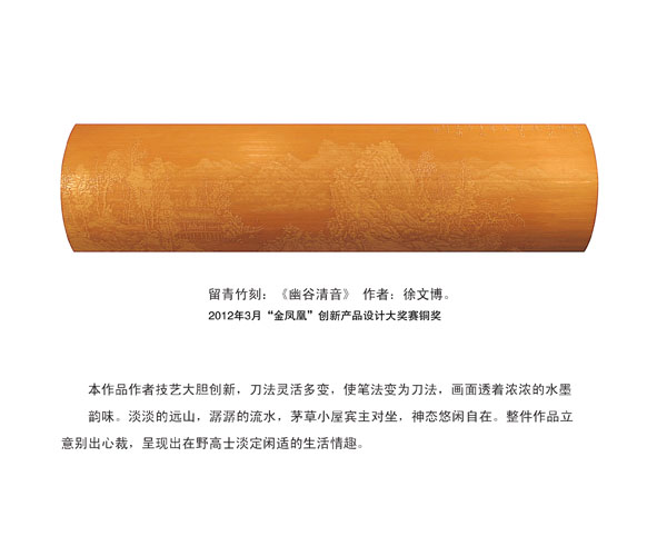 徐博(藝名文博),1973年生,江蘇武進(jìn)人,江蘇省省名人,高級(jí)工藝美術(shù)師,常州市留青竹刻非遺傳承人,常州工藝美術(shù)家協(xié)會(huì)理事,被譽(yù)為當(dāng)今中國(guó)最具創(chuàng)新意識(shí)的新銳竹刻家代表,多次獲得國(guó)家工藝美術(shù)大獎(jiǎng)?釔(ài)留青竹刻的徐文博賞竹為樂(lè),以竹詠志,借竹抒懷,悉心探索留青竹刻的藝術(shù)表現(xiàn)。在中國(guó)工藝美術(shù)大師蕭劍波的精心指導(dǎo)下,開(kāi)創(chuàng)留青水墨山水之技法,更好的體現(xiàn)了竹刻淡雅清秀的藝術(shù)風(fēng)格,并不斷汲取書(shū)畫(huà)、攝影、雕塑等藝術(shù)精華,不斷滋養(yǎng)藝術(shù)情趣,提升擴(kuò)展胸襟人格的同時(shí)也逐步形成了其形神兼?zhèn),虛?shí)相生,氣韻生動(dòng)的藝術(shù)特點(diǎn),作品為眾多的國(guó)內(nèi)外收藏家珍藏。
