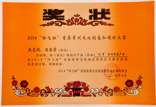 公司榮譽(yù)介紹: “2009年常州市旅游商品創(chuàng)新設(shè)計大賽”,“覽盡千荷”綠檀雕刻梳榮獲三等獎; “2011年常州市旅游商品創(chuàng)新設(shè)計大賽”,“彩印工藝梳-我們的年代(80)”榮獲二等獎。 “2011年中國包裝創(chuàng)意設(shè)計大賽“,虞美人彩印梳篦系列包裝獲得一等獎; “2011年中國包裝創(chuàng)意設(shè)計大賽”,虞美人筷子系列包裝獲得三等獎; “2011創(chuàng)意中國.第五屆設(shè)計藝術(shù)大獎賽”,虞美人系列包裝獲得三等獎; “2011首屆中國(無錫)國際文化藝術(shù)博覽會”,漆藝對梳《喜玫瑰》獲得“藝博杯“銅獎。 “第十三屆中國工藝美術(shù)大師作品暨國際藝術(shù)精品博覽會”, 漆藝梳《報喜鳥》榮獲2012“儒士儒家•百花杯”中國工藝美術(shù)精品獎優(yōu)秀獎 “第十三屆中國工藝美術(shù)大師作品暨國際藝術(shù)精品博覽會”, 虞美人《渾然天成》榮獲2012“儒士儒家•百花杯”中國工藝美術(shù)精品獎金獎 “2012江蘇省工藝美術(shù)精品大獎賽”,虞美人《S型梳》喜獲“藝博杯”銀獎 “第十四屆中國工藝美術(shù)大師作品暨國際藝術(shù)精品博覽會”, 虞美人工藝梳《新型十二星座梳》榮獲2013“國信•百花杯”中國工藝美術(shù)精品獎優(yōu)秀獎 “2013【藝博杯】江蘇省工藝美術(shù)精品大獎賽”,虞美人《萬事如意系列》喜獲“藝博杯”銀獎 “2013江蘇省工藝美術(shù)新人新作成果展作品大獎賽”,虞美人《壺(福)的藝術(shù)》喜獲“藝博杯”入圍獎 2013年度江蘇省“蘇商領(lǐng)袖峰會”,常州市卓尚飾品有限公司榮獲最具成長性企業(yè)獎 常州市卓尚飾品(虞美人)有限公司總經(jīng)理李衛(wèi)東榮獲“常州創(chuàng)意產(chǎn)業(yè)協(xié)會2013年底慈善獎榮譽(yù)” 常州市卓尚飾品有限公司榮獲薛家鎮(zhèn)人民政府2013年度“創(chuàng)新創(chuàng)優(yōu)”獎 常州市卓尚飾品有限公司榮獲薛家鎮(zhèn)人民政府2013年度“銷售業(yè)績”獎 2014中國(深圳)國際文化產(chǎn)業(yè)博覽交易會,劉燕西、李衛(wèi)東、段筆耕<十二星座系列>獲得“中國工藝美術(shù)文化創(chuàng)意獎”銀獎 2014中國(深圳)國際文化產(chǎn)業(yè)博覽交易會,徐德鴻、李衛(wèi)東、段筆耕《漆彩人生系列》獲得“中國工藝美術(shù)文化創(chuàng)意獎”銅獎 文化創(chuàng)意大獎賽“紫金獎” ,有余(魚)系列梳篦產(chǎn)品獲得了優(yōu)秀獎 2014吟飛杯首屆常州文化創(chuàng)意和設(shè)計大賽,虞美人有余(魚)系列梳篦產(chǎn)品榮獲優(yōu)秀設(shè)計獎 2014吟飛杯首屆常州文化創(chuàng)意和設(shè)計大賽,虞美人“云,月”系列梳篦產(chǎn)品榮獲優(yōu)秀設(shè)計獎 2014藝博杯江蘇省工藝美術(shù)精品大獎賽,虞美人《梳篦:酒醉的探戈》喜獲銀獎 2014“中國原創(chuàng)•百花杯”中國工藝美術(shù)精品大獎賽,虞美人《梳篦-江南風(fēng)韻系列》喜獲銀獎 常州市卓尚飾品有限公司獲“2014年常州市電子商務(wù)協(xié)會2014年度優(yōu)秀會員單位” 2014“虞美人”成為常州市知名商標(biāo)。