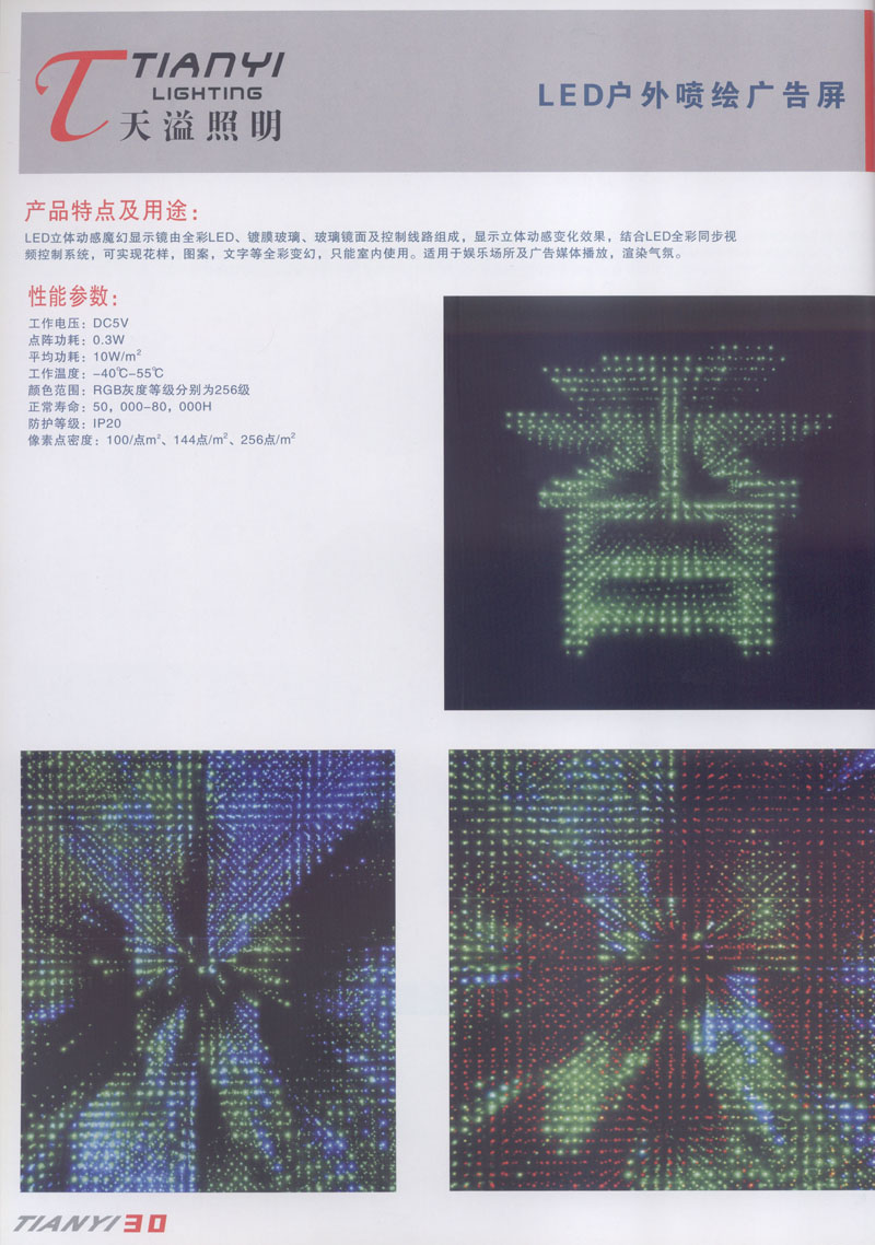 天溢照明是中國(guó)領(lǐng)先的專業(yè)從事LED廣告照明裝飾燈具設(shè)計(jì)、系統(tǒng)開發(fā)、燈具制造、工程服務(wù)一體的專業(yè)型公司,本公司產(chǎn)品已廣泛應(yīng)用于全國(guó)大多數(shù)城市夜景亮化景觀照明、酒店休閑娛樂夜場(chǎng)夢(mèng)幻燈光、戶內(nèi)外廣告宣傳、建筑及室內(nèi)照明以及家居裝飾等場(chǎng)合。 本公司產(chǎn)品涵蓋景觀裝飾照明、商用照明、居家照明、信息廣告顯示等領(lǐng)域,我們將性能可靠與適中價(jià)格的LED全系列產(chǎn)品帶到世界各個(gè)、角落。